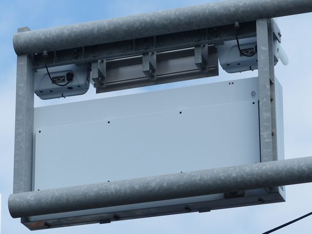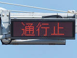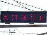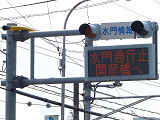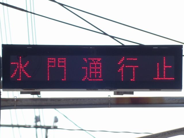 水門橋のすぐ西には信号交差点がありますが、水門橋と信号交差点の間に駐車場の出入口が面しているため、水門橋封鎖時でも信号サイクルは変わりませんが、信号機に併設されたLED式表示板で「水門通行止」の案内を行います。(小型の表示板は「水門」と「通行止」を交互に表示します。)