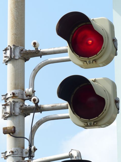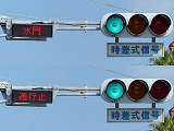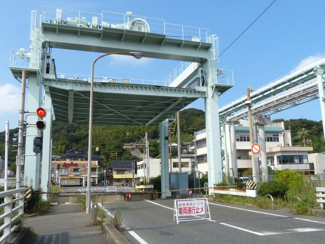 船の往来のために道路が橋桁ごと上下する水門橋で、毎日、特定の時間帯に道路が封鎖されます。このため、信号機や踏切を使って、交通誘導や注意喚起を行っています。水門橋東詰では、1位式灯器2基を縦に並べて設置し、踏切警報機として封鎖時には赤を交互点滅させています。なお、点滅速度は通常の踏切や信号機の点滅に比べ、かなり遅いものとなっています。