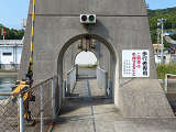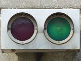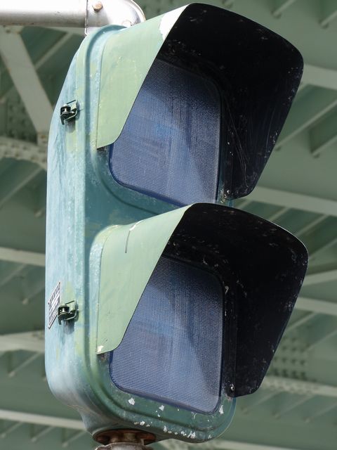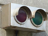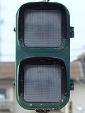 歩行者用通路には2位式灯器が設置されており、船の航行により封鎖する場合に赤信号になると思われます。なお、歩行者用のためか、左から赤・青の配列となっています。灯器の銘板は見当たりません。この模様のレンズは、交通信号灯器でも似たものが使用されていたことがあります。