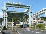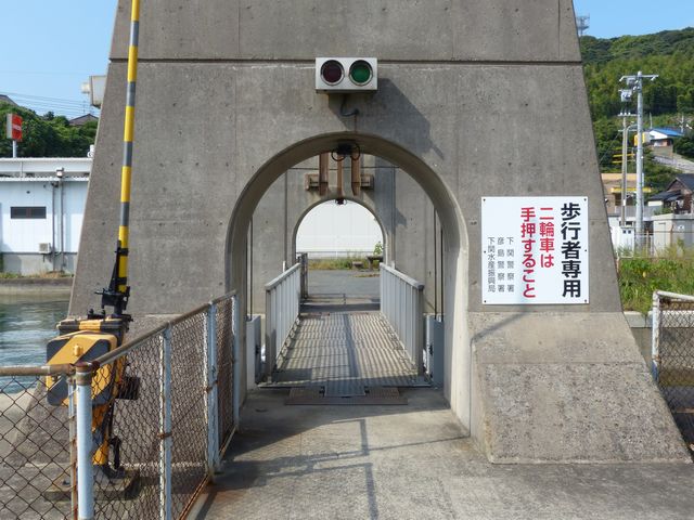 この水門はパナマ運河式です。この橋の両脇に軽車両・歩行者用の通路があり、水門橋が封鎖されていても、船の航行がなければ歩行者等はその通路を通行することができます。船が航行する場合、その通路は、どちらかが通れなくなります。水門橋東詰、西詰とも緑色塗装の歩行者用灯器筐体を使用した「歩行者案内灯」が設置されており、一方の歩行者用通路が封鎖されている場合、この灯器で歩行者等を誘導すると思われます。