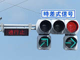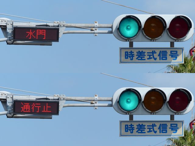 水門橋のすぐ東にも信号交差点がありますが、こちらは水門橋までの間に車両が出入りする施設がないため、水門橋封鎖時には車両が水門橋の方へ進行できない信号サイクルとなり、併設されたLED式表示板で「水門通行止」の案内を行います。水門橋の方からの車両に対しては常に赤信号となります。