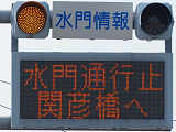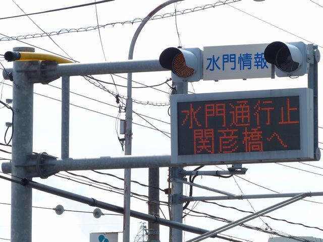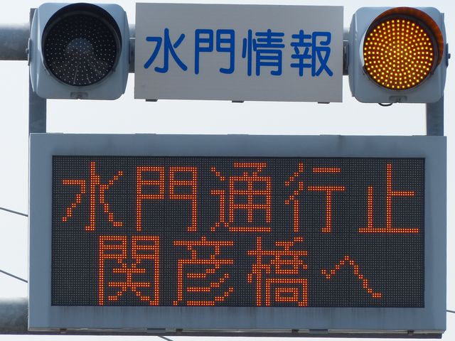 付近の道路では、水門橋封鎖時に迂回路となる関彦橋へ誘導する表示板が設置されています。水門橋封鎖時のみ左右の黄灯が交互点滅し、誘導表示を行います。なお、点滅速度は通常の信号機の点滅に比べ、速いものとなっています。