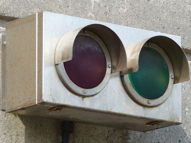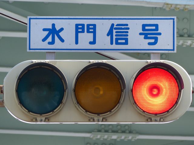 水門橋西詰には3色灯器が設置されており、水門橋封鎖時に赤信号になります。