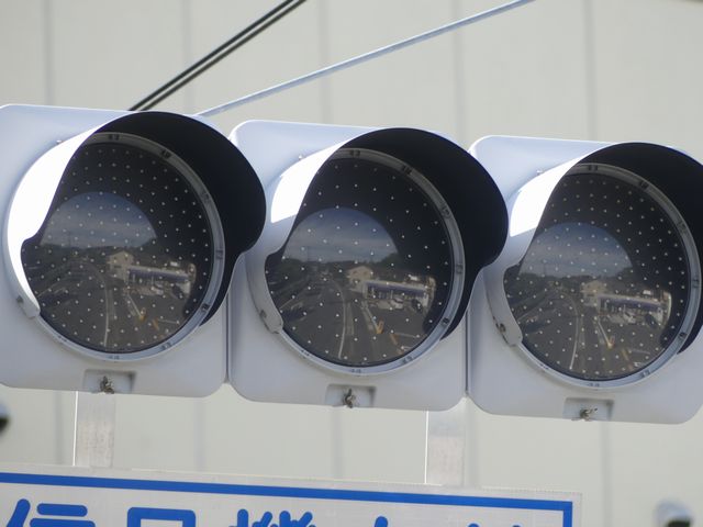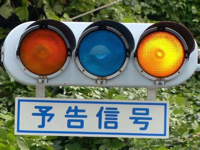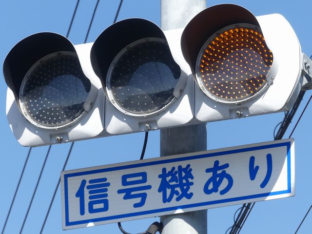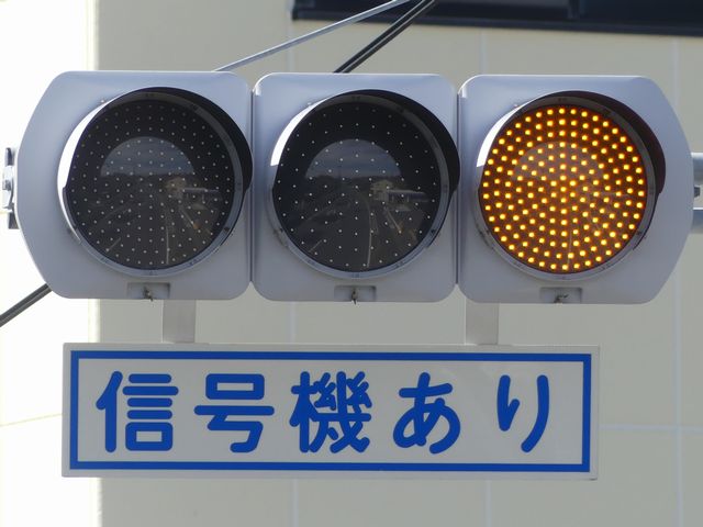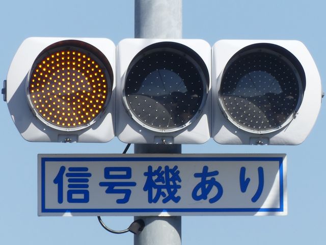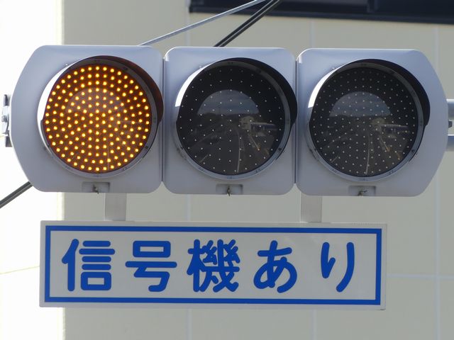 黄・青・黄配列の「予告信号」ですが、前方の信号に関わらず常時左右の黄が交互点滅しています。真ん中の青は使用しません。