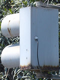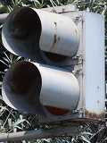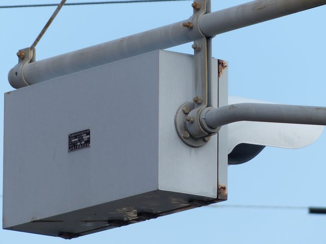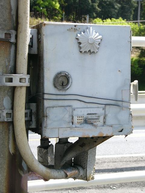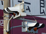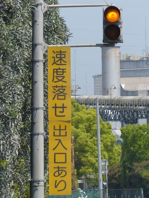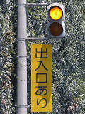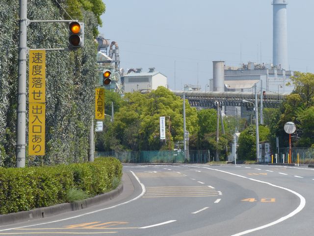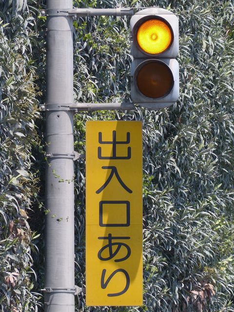 工業地域で道路に駐車場の出入口が面していますが、見通しが悪いので、注意喚起のために上下の黄が交互に点滅する2位式灯器が設置されています。点滅速度は通常の点滅より遅くなっています。連続で2基設置されていますが、点滅間隔はバラバラです。