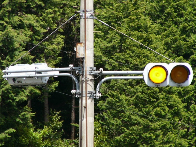カーブの中程に、両方向に対して設置され、左右の黄が交互点滅しています。付近に信号交差点はありませんので予告信号ではありません。カーブに対する注意喚起と思われます。