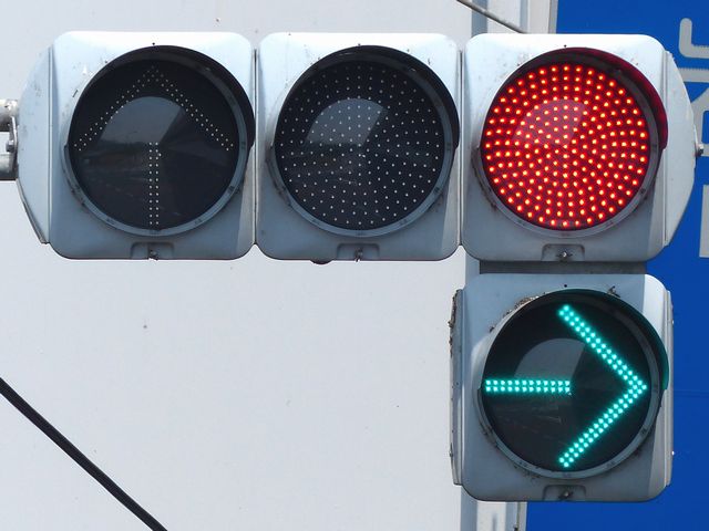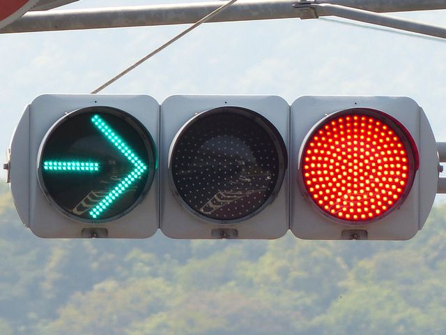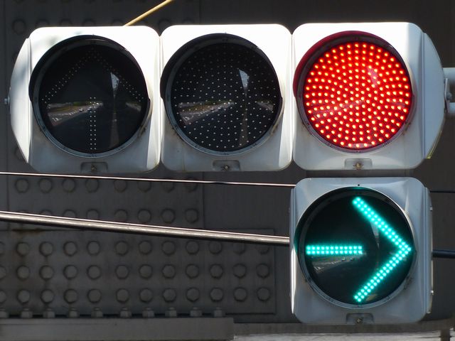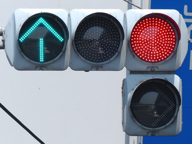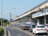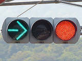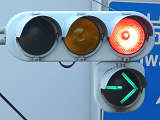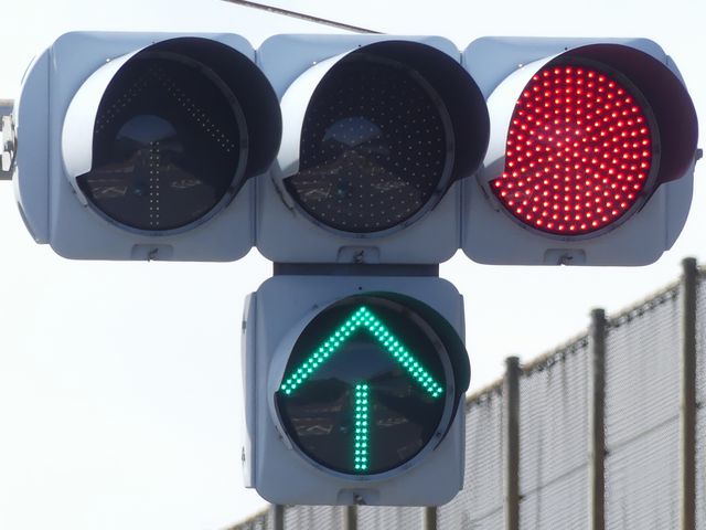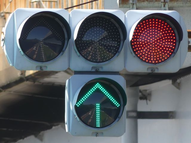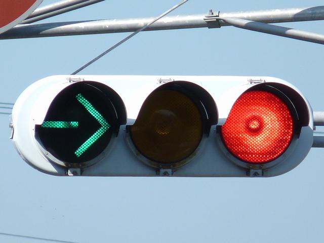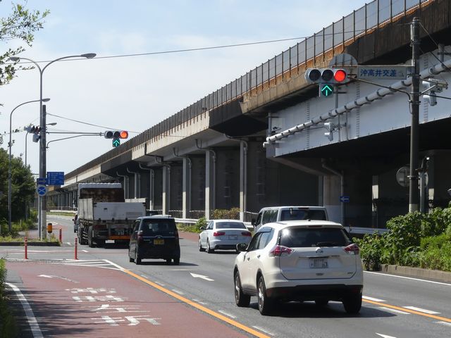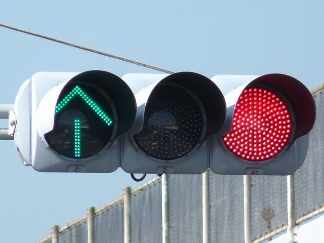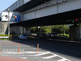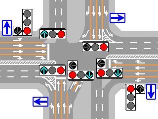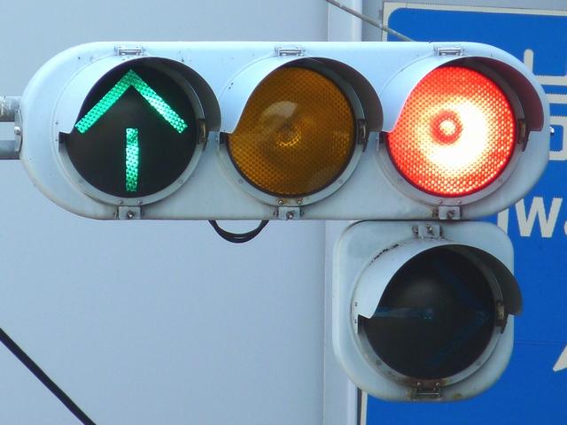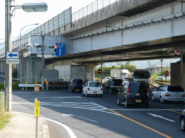 右折車分離式信号で青信号にならないため、本来の青灯の部分に直進矢印が組み込まれて、その矢印を使用していました。「左折可」の標示板により、常時左折可となっているため、左折の矢印信号はありません。なお、西進(地図の上が西)の直進車線と右折車線は高架道路の橋脚で分離されているため、直進車と右折車の信号機が別々に設置されています。
