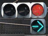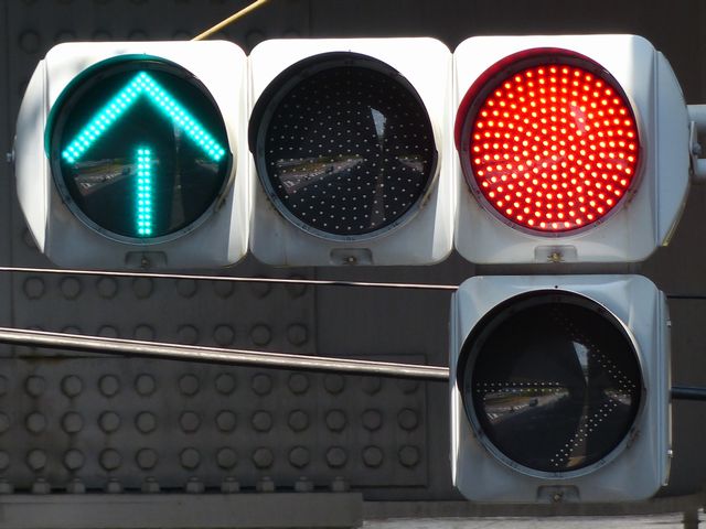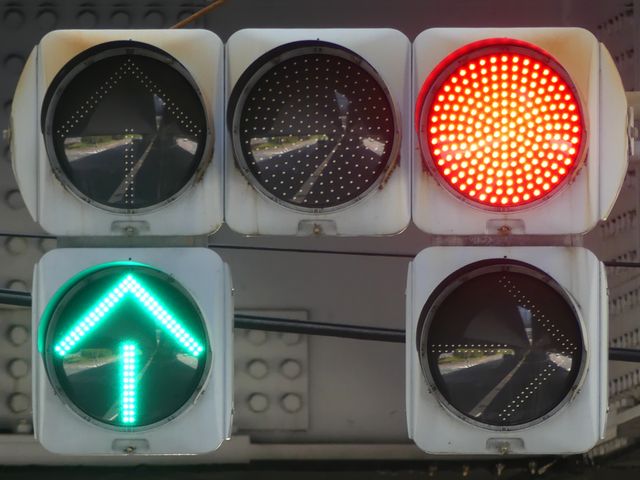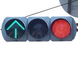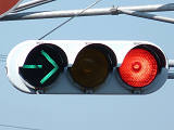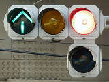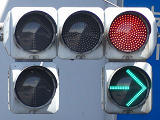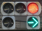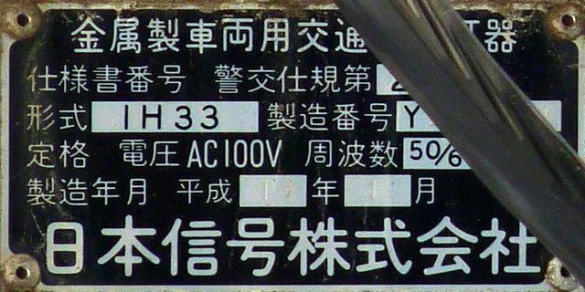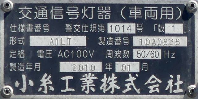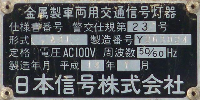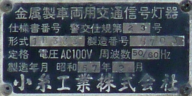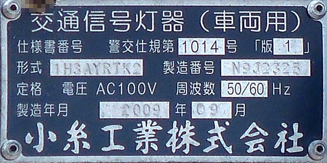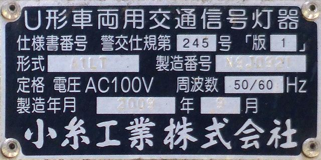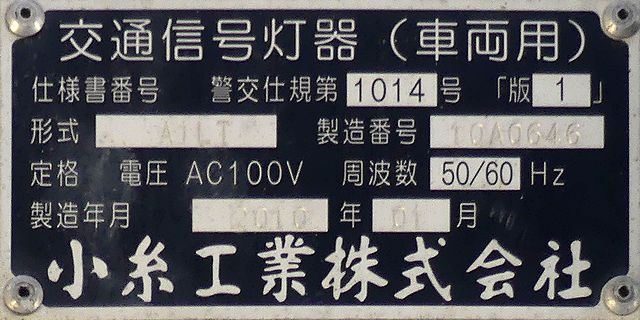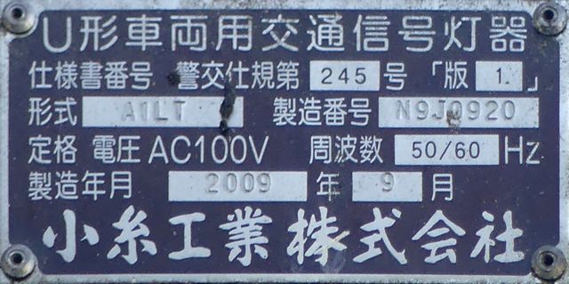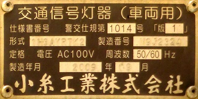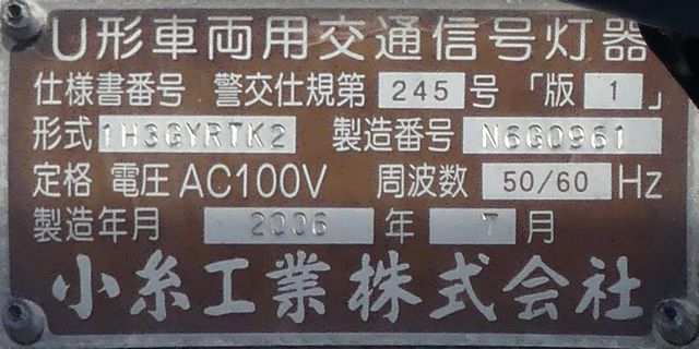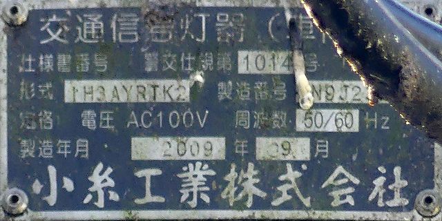 小糸製のLED式灯器は銘板の形式の欄に灯火の配列が記載されていますが、2009年9月時点で設置されていた灯器は通常の灯器と同じで「青・黄・赤」を表す「GYR」になっています。 歩行者用灯器はなく、歩行者に対しては常に赤信号(または黄信号)となるので、歩行者はずっと横断できません。歩行者は、地下横断歩道があるのでそちらを利用することになります。 なお2020年ごろに、直進矢印に限り本灯器の下に矢印灯器が追加され、そちらの矢印を使用するように変更されました。右折矢印を組み込んだものはそのままであり、特に警察庁の通達に従って変更したというわけではないようです。(一部灯器で直進矢印を左下に配置しているという点でも警察庁の通達には従っていません。)