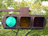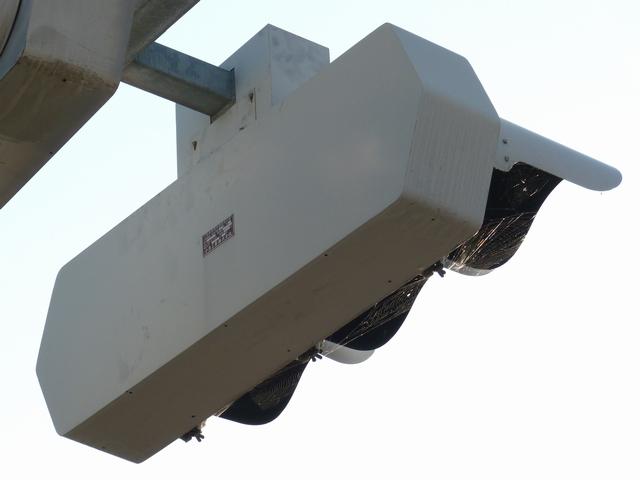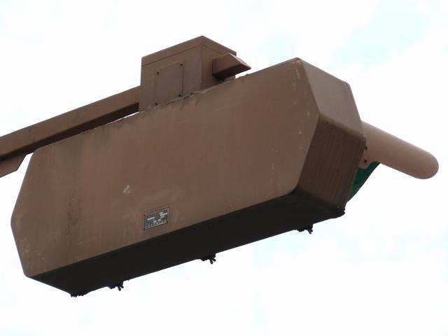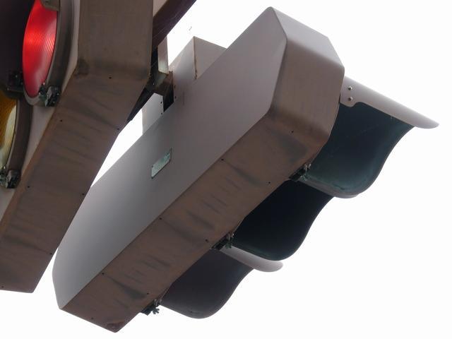 この交差点にはレンズ周りに縁がありフードが角ばったタイプの灯器が設置されています。銘板はありません。