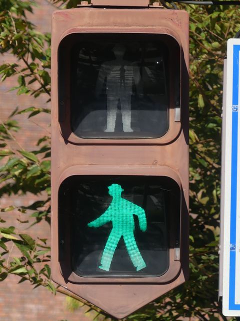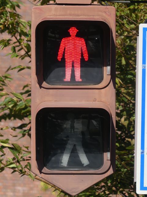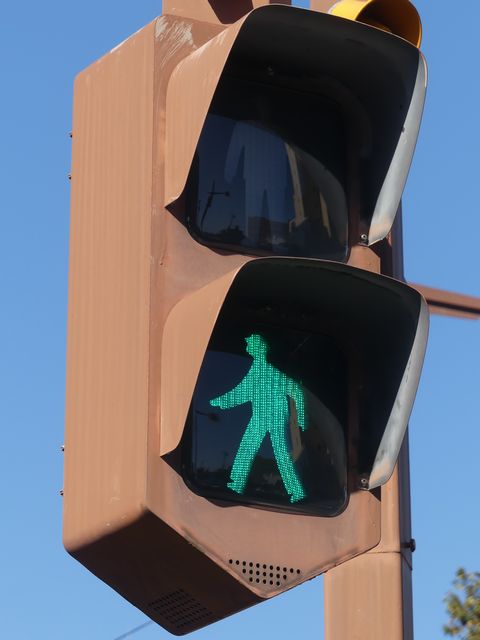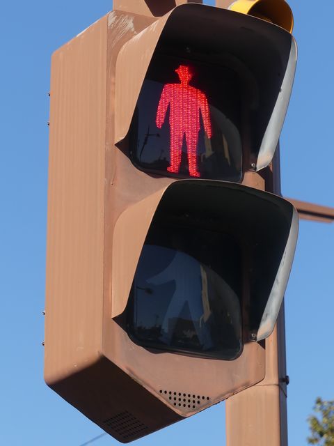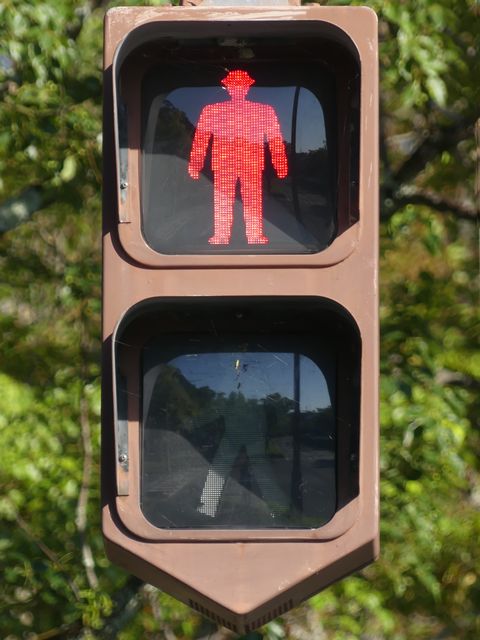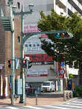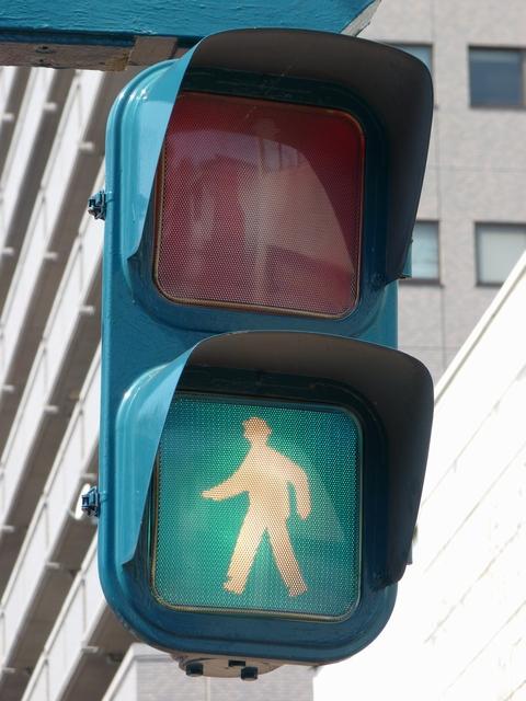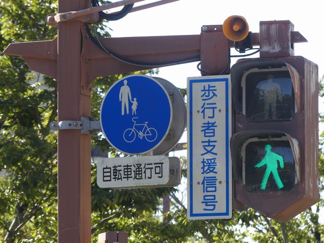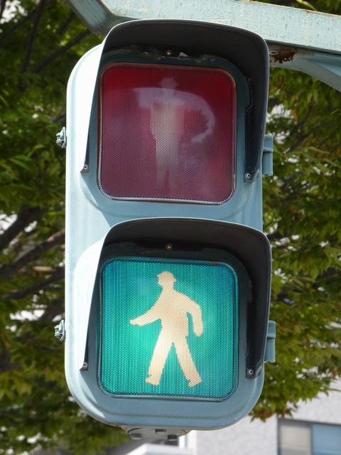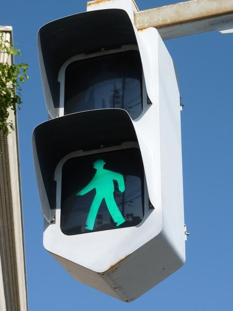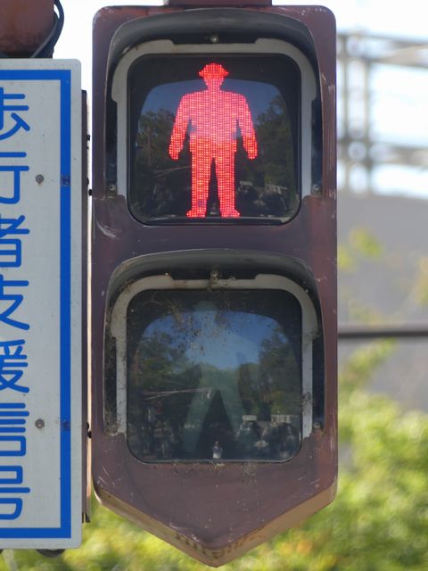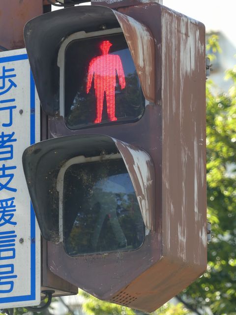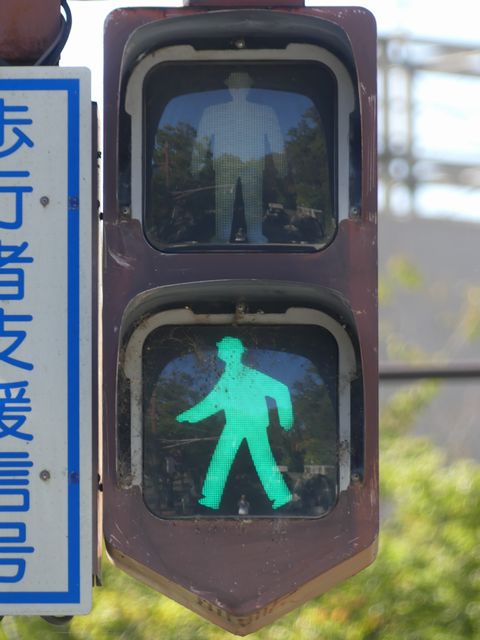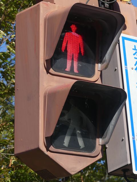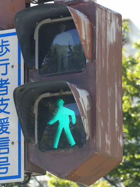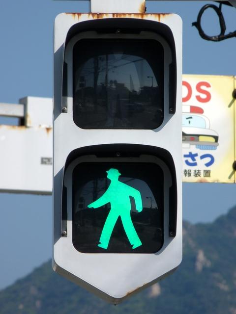 防府市街に設置されている5角形歩行者用灯器です。歩行者用灯器は当初電球式だったものにLEDユニットを組み込んだものです。