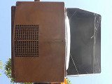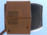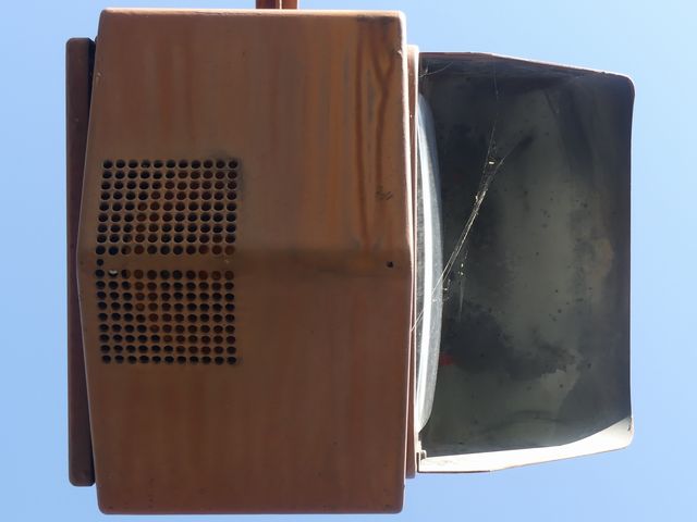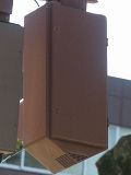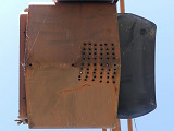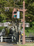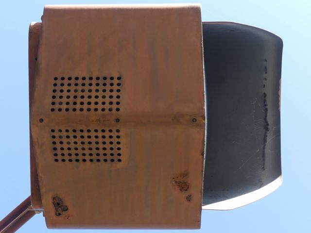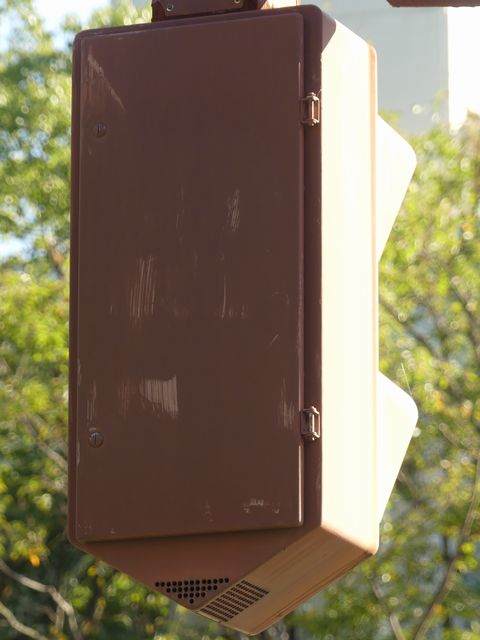 後者の灯器はこの交差点に1台設置されており、元々白塗装だったデザイン灯器をコゲ茶色に再塗装して使用しているようで、色剥げやレンズ周りの塗り残しが見られます。また、灯器底面の内蔵スピーカー用の穴がフリーハンドで開けられています。製造番号が防府市街に設置されている白塗装のデザイン灯器と近く、防府市街に設置されていたものを転用した可能性があります。
