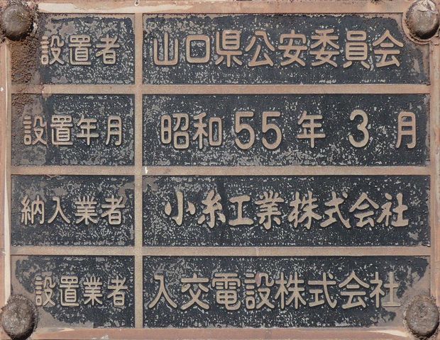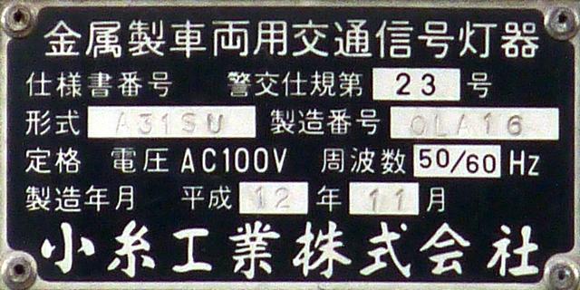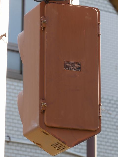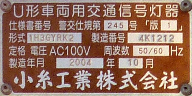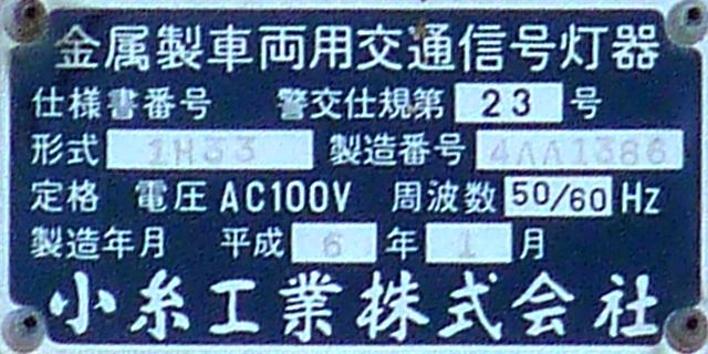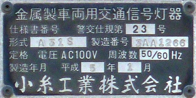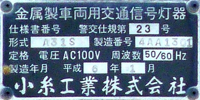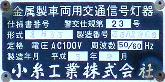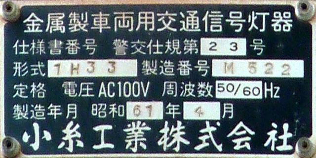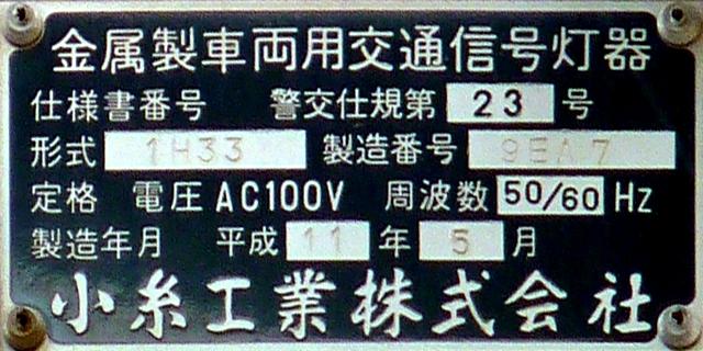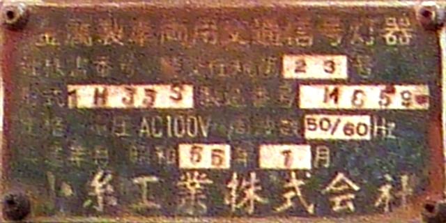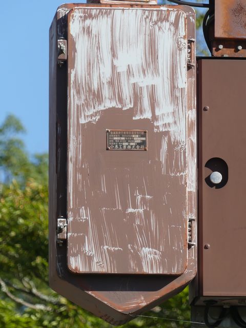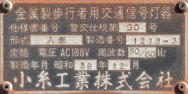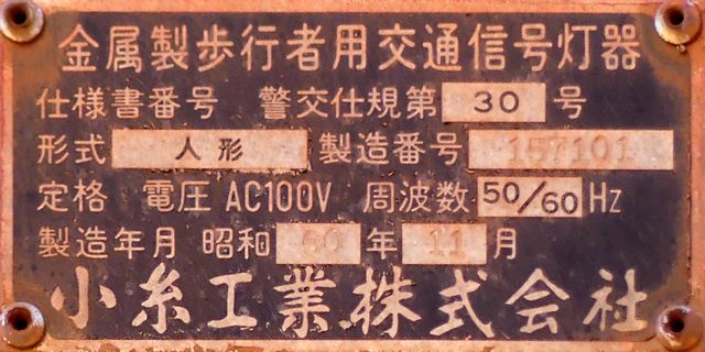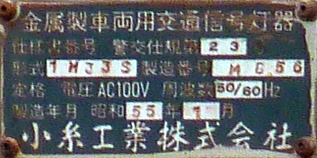 前者の灯器は銘板がなく製造年月がわかりませんが、設置されている信号柱には「昭和55年3月」設置の銘板があり、同じころの製造と思われます。