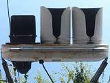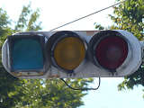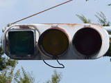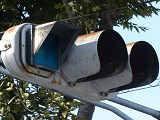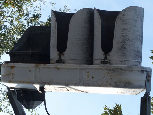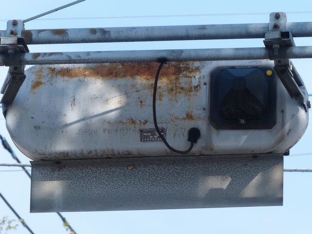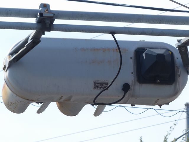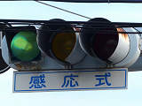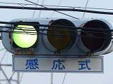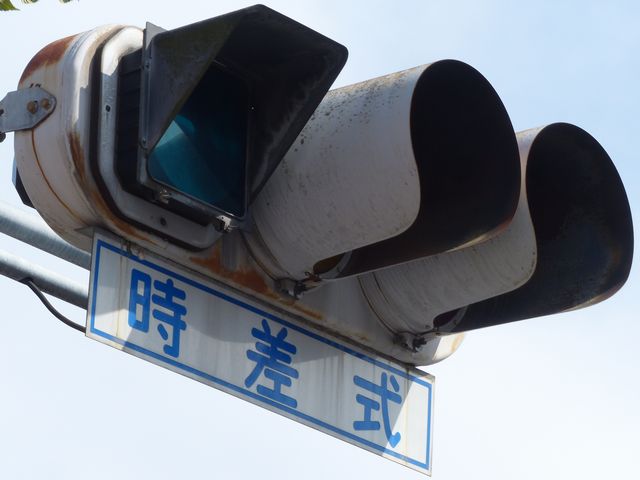 連続交差点(奥の交差点)の誤認防止のため、青のみ偏光レンズ灯器を組み込んでいます。しかし、歩行者用灯器が無く、これでは青信号のときに歩行者から信号が見えません。
