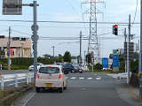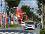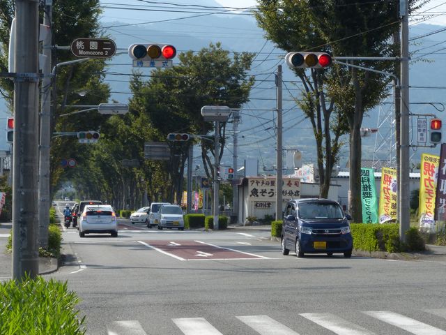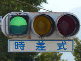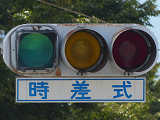 連続交差点間の滞留防止のため、時差式信号となっており、奥交差点の方が長く青信号になっています。