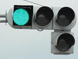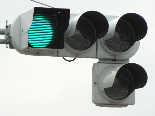 連続交差点(奥の交差点)の誤認防止のため、青のみ距離制限フードになっています。