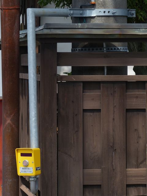 塀の内側に信号柱があるため、塀の上からアームを伸ばして押ボタン箱を設置しています。