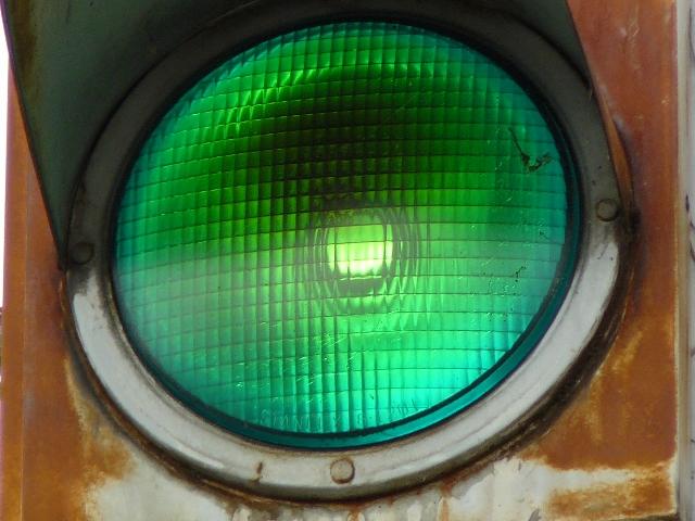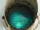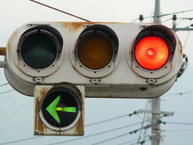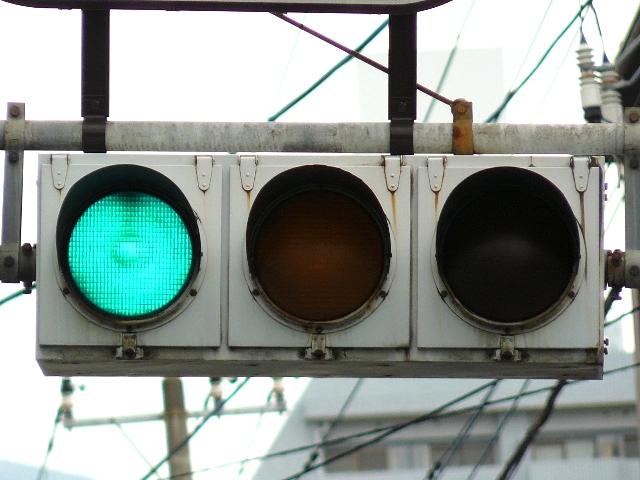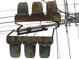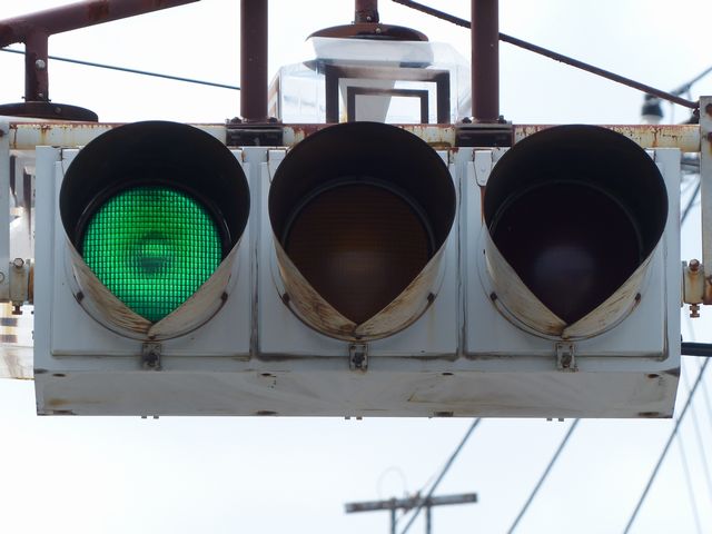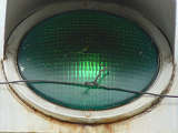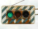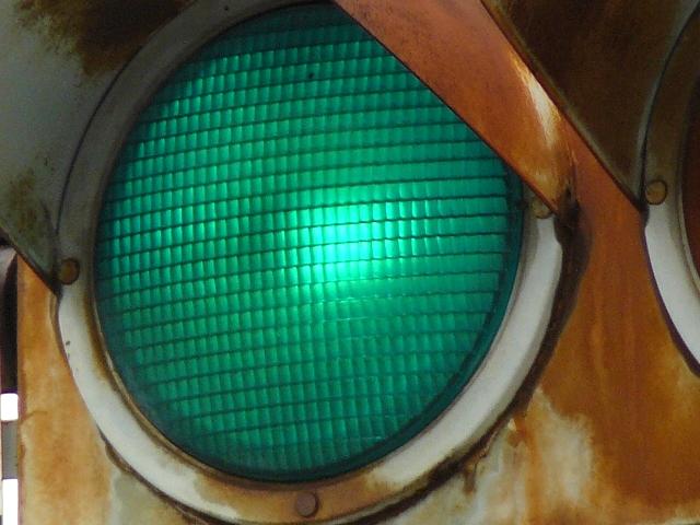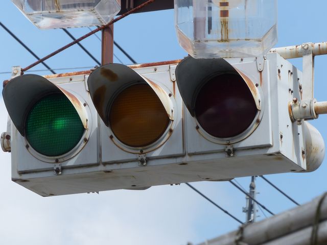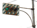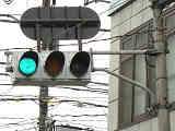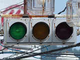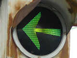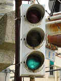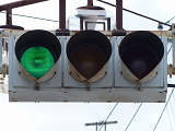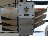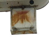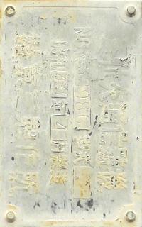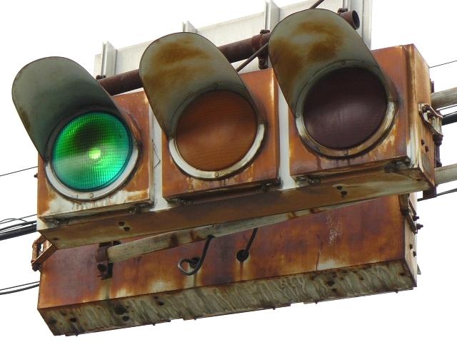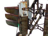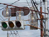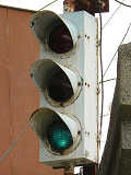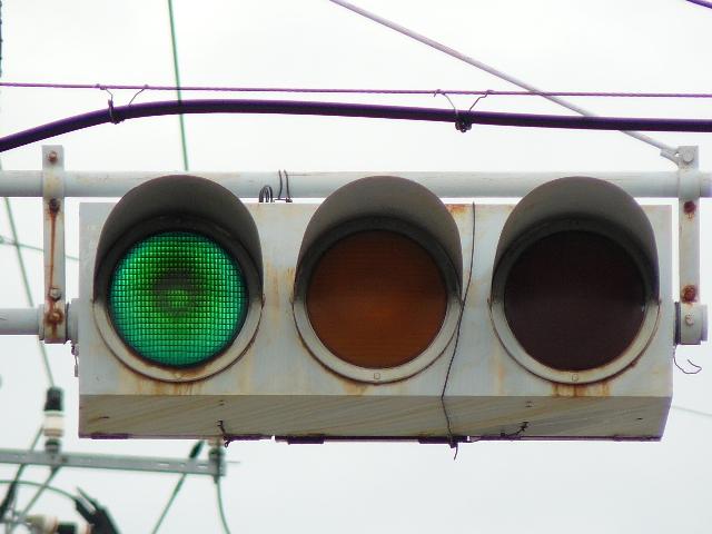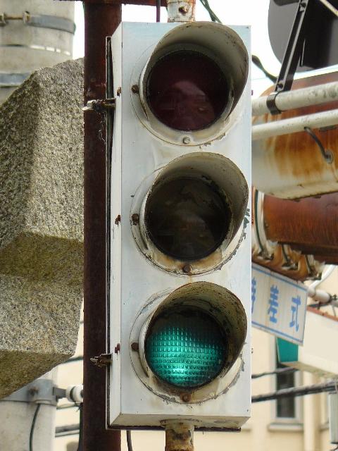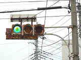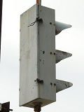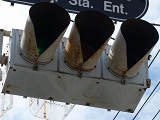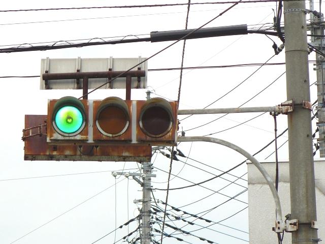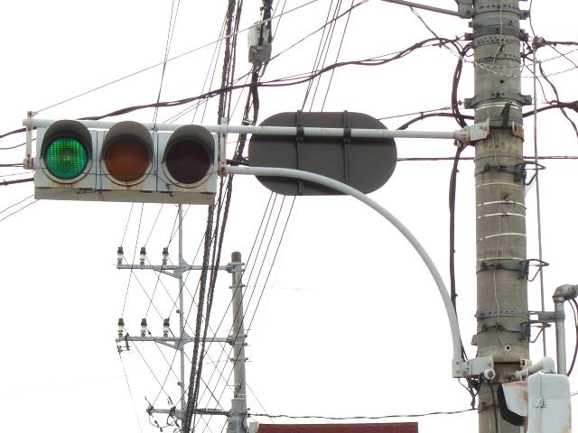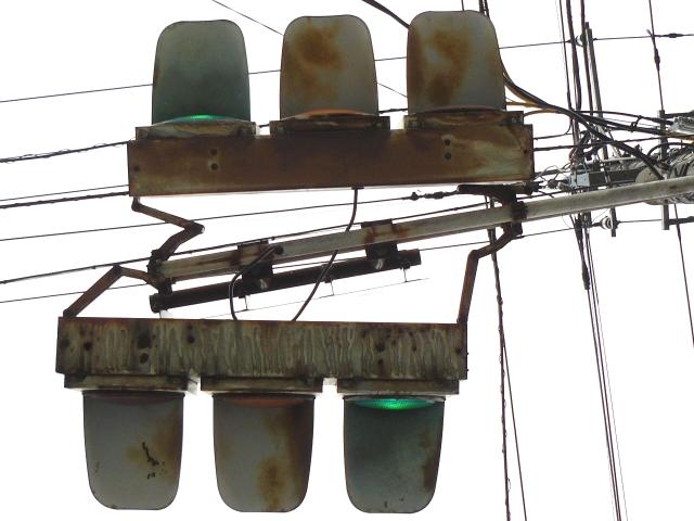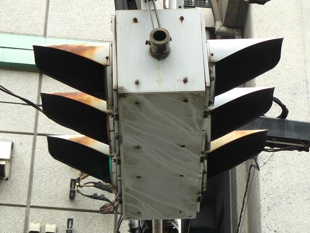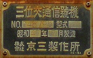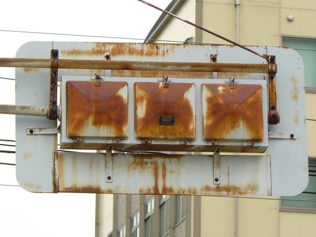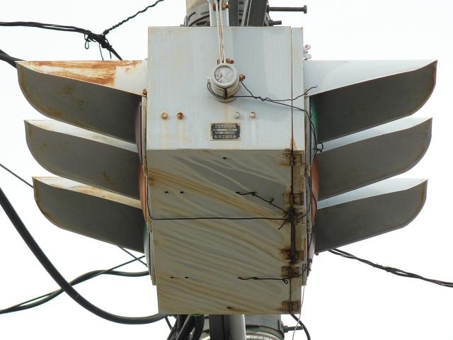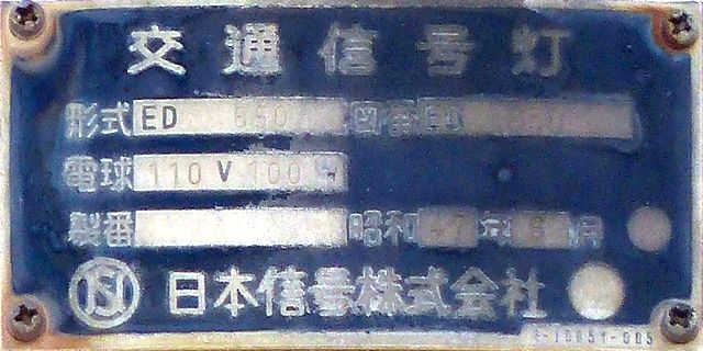 通常の角型灯器は灯器にアームを串刺しにして設置しますが、この設置方法は現在の灯器と同じでアームの前に設置しています。前後それぞれの灯器に銘板が付いています。 |