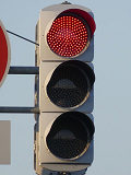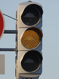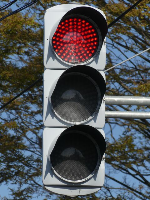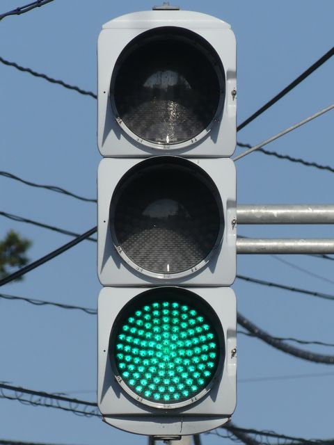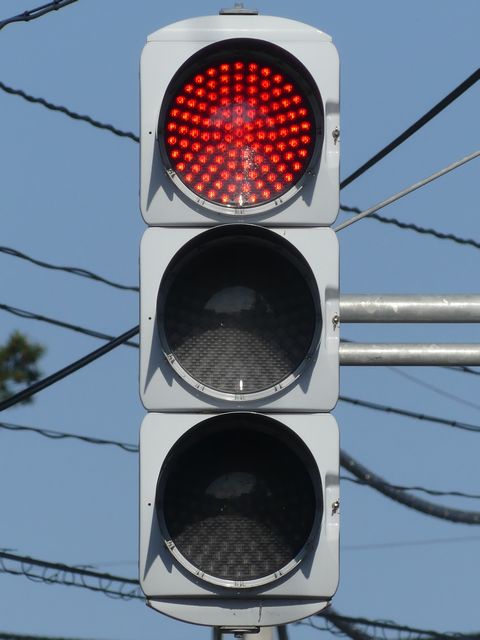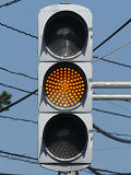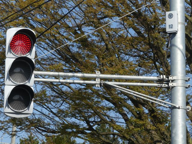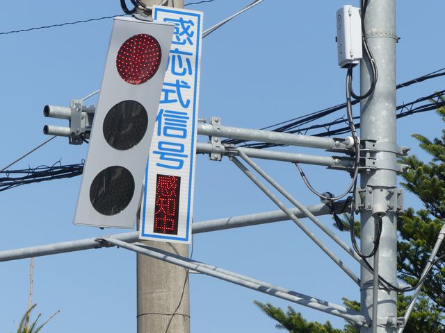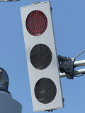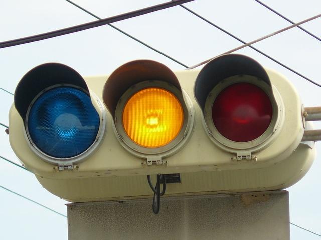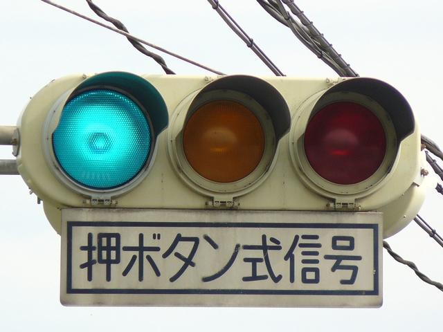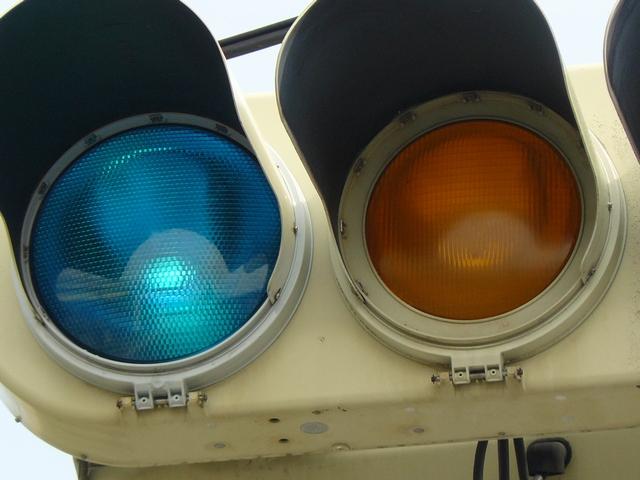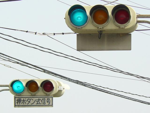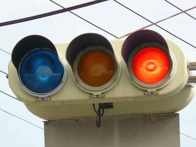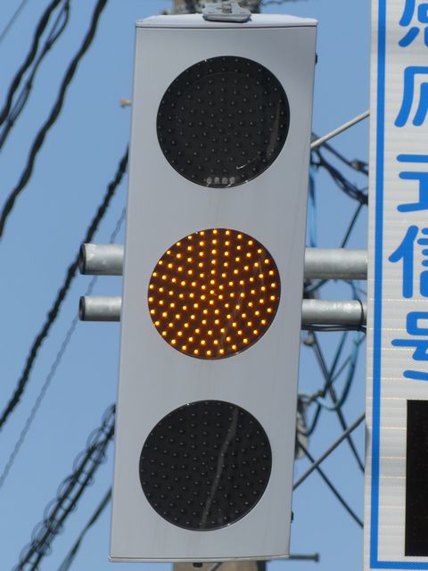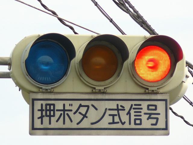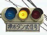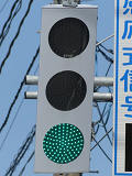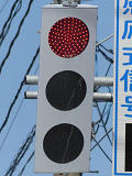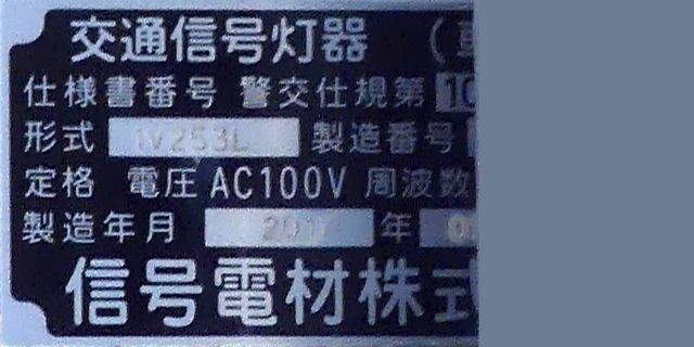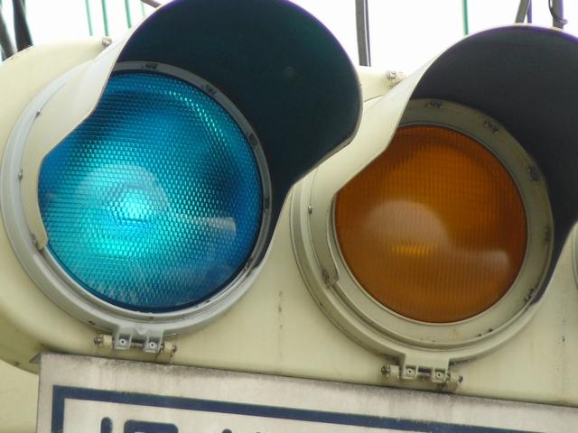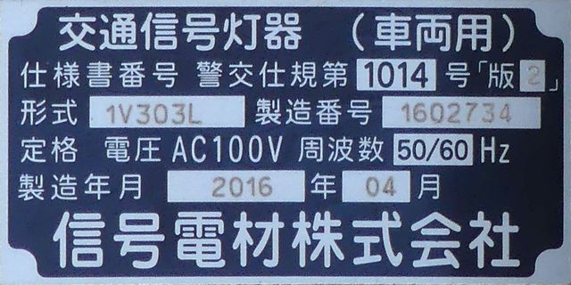 青のみ直径300mmレンズです。樹脂製灯器で黄ばみが見られますが、青の蓋のみ黄ばんでいないため、蓋ごと交換されたようです。通常青信号の「押ボタン式信号」のため、青の点灯時間が極端に長く、レンズ焼けしてしまったと思われます。