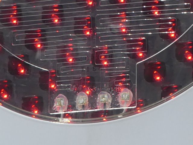 もっとも重要な赤灯のレンズに融雪ヒーターを取り付けています。低コスト灯器でレンズ径が小さくなったこともあり、ヒーターがかなりの面積を覆うようになりました。