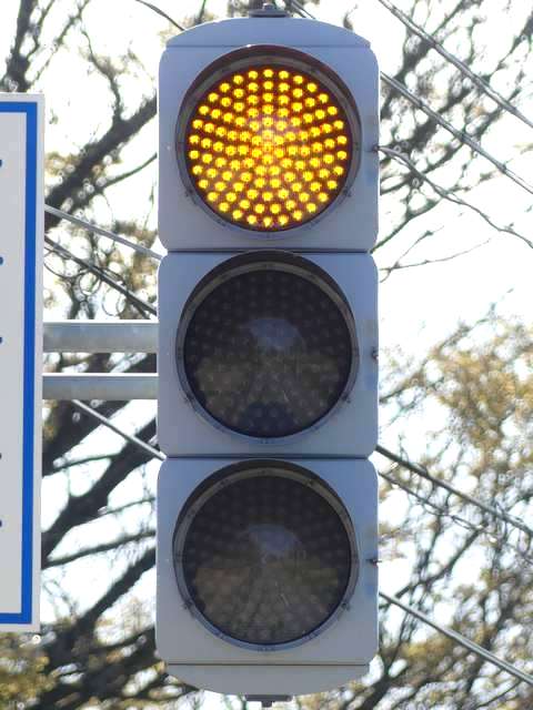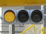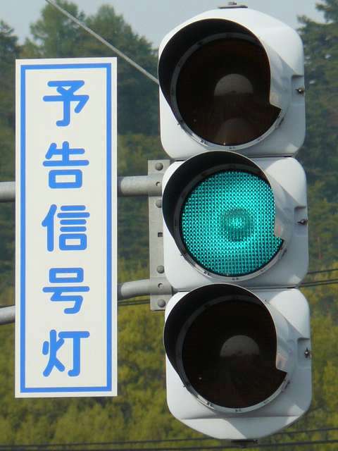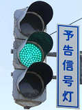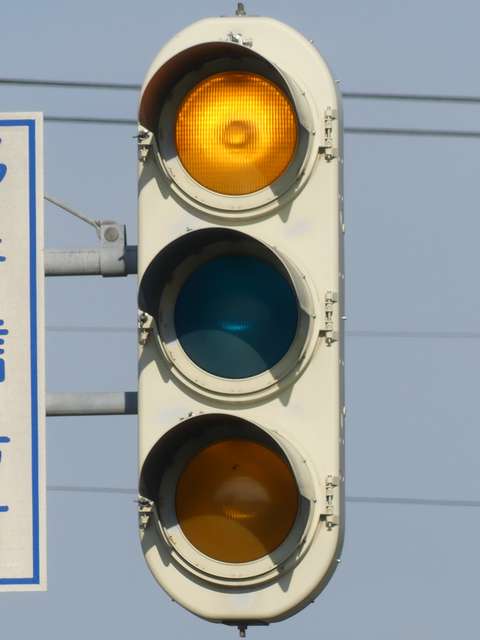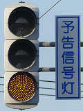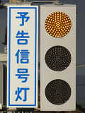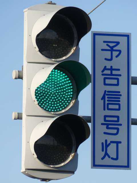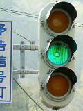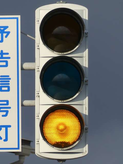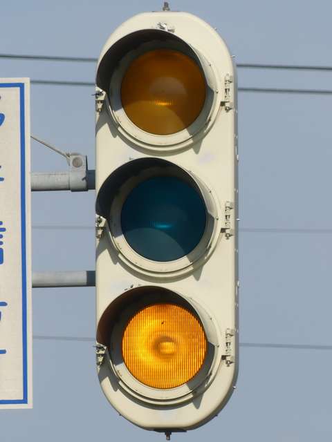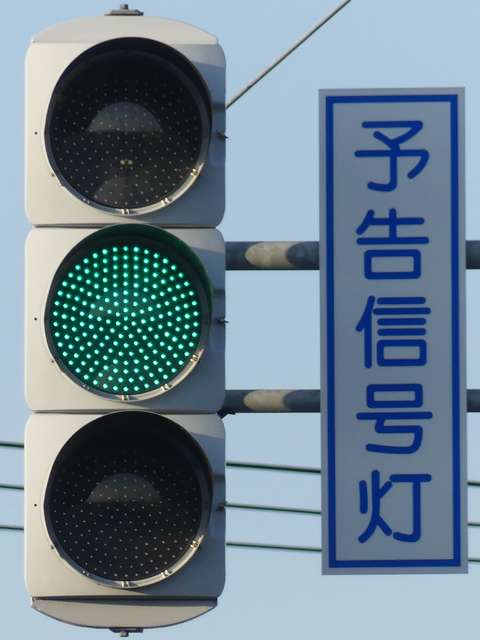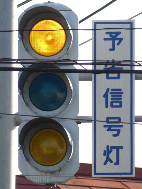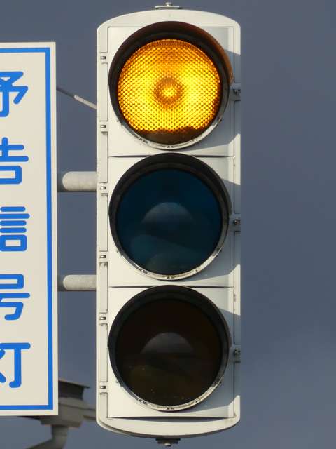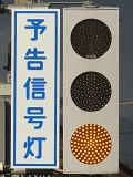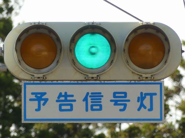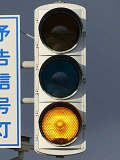 信号交差点手前の道路がカーブしている等で信号を見通せない箇所に設置される黄・青・黄配列の「予告信号灯」です。前方の信号に連動し、前方が青信号のときは青信号になり、赤信号のときは左右の黄が交互に点滅し、注意を促します。