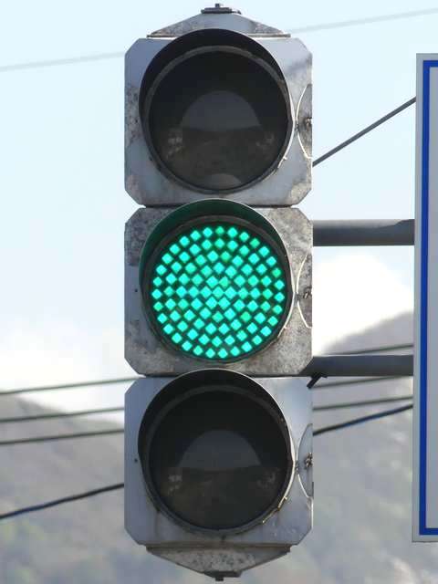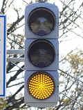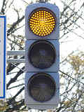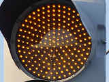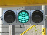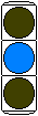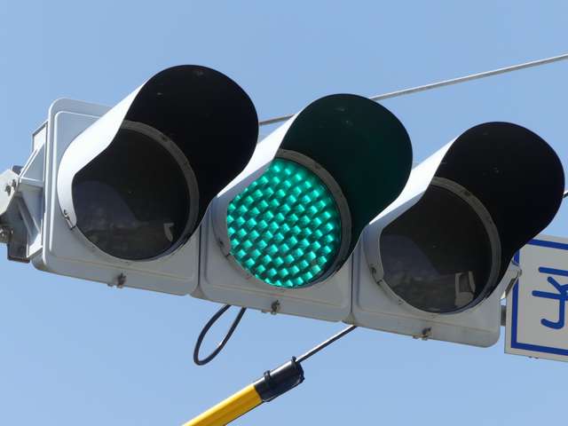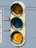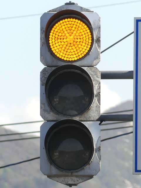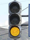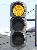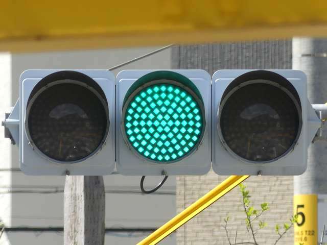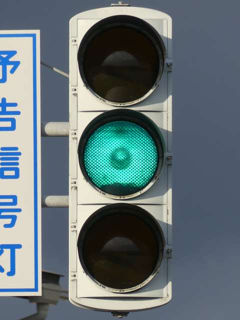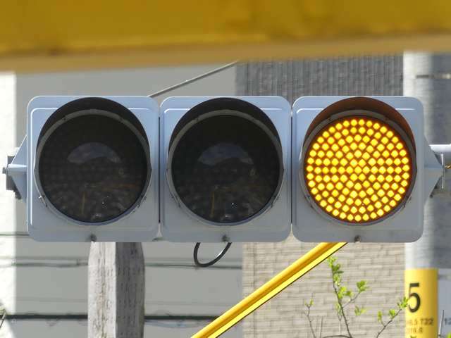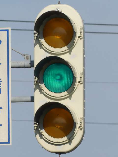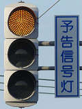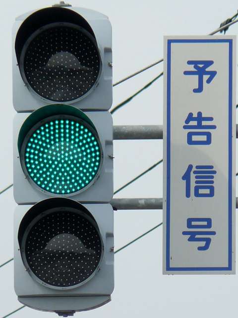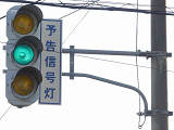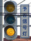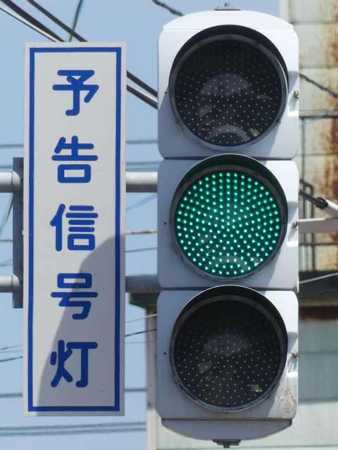 信号交差点手前の道路がカーブしている等で信号を見通せない箇所に設置される黄・青・黄配列の「予告信号灯」です。前方の信号に連動し、前方が青信号のときは青信号になり、赤信号のときは左右の黄が交互に点滅し、注意を促します。