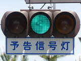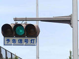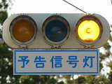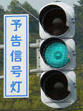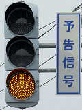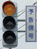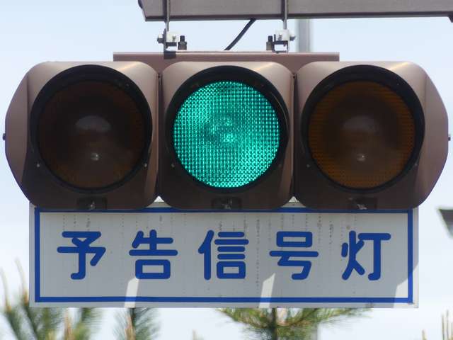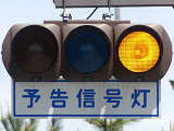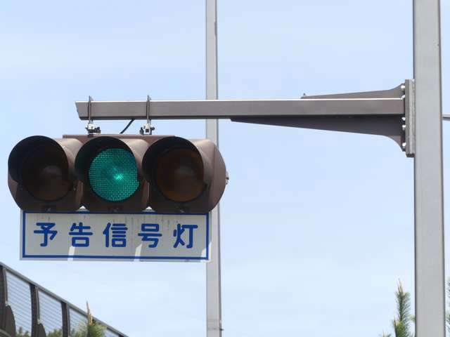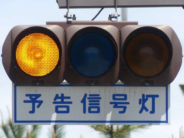 ここでは信号交差点の手前の道路がカーブしているため、「予告信号灯」が設置されています。前方の信号が黄信号になる5秒前に点滅を開始します。
