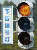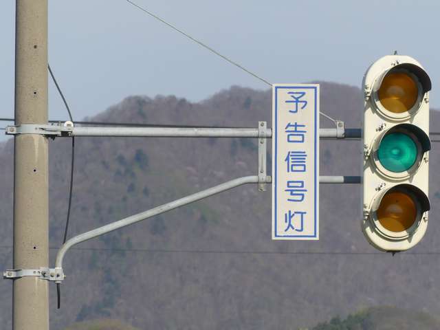 信号交差点の手前の道路がカーブしており、また、起伏があるため、「予告信号灯」が設置されています。前方の信号が黄信号になるのと同時に点滅を開始します。