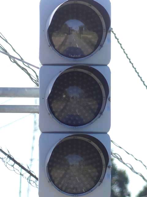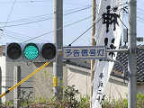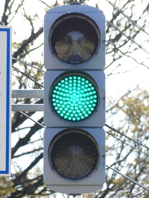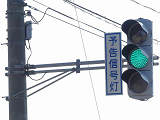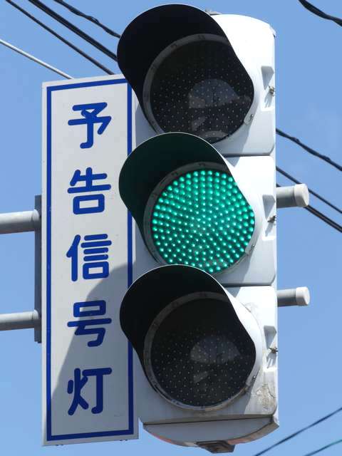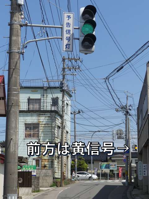 信号交差点の手前の道路がカーブしているため、「予告信号灯」が設置されています。前方の信号が黄信号になっても青信号のままで、赤信号になるのと同時に点滅を開始する非常に珍しい信号サイクルです。