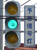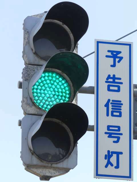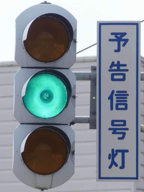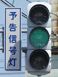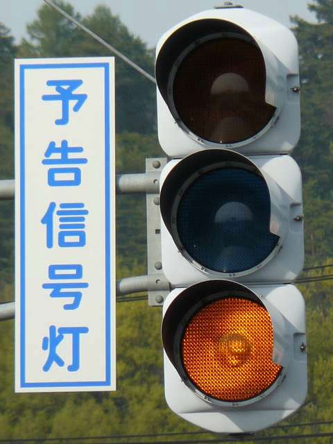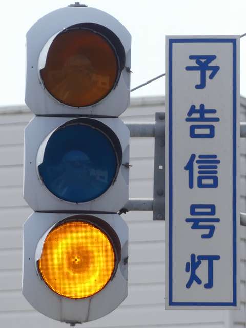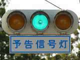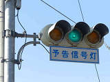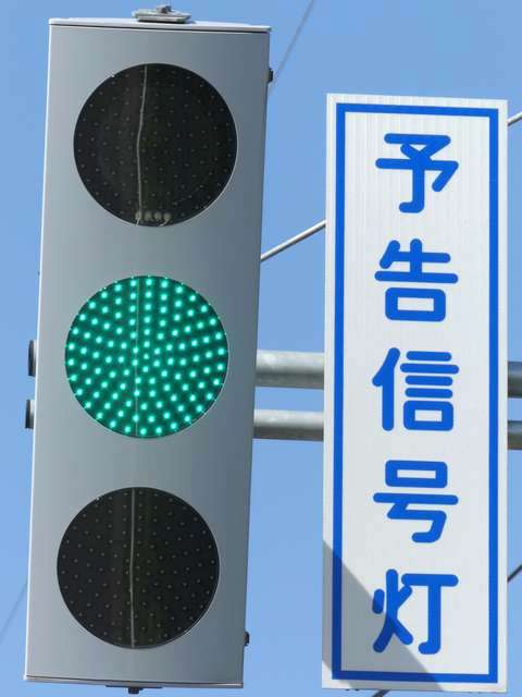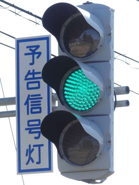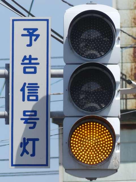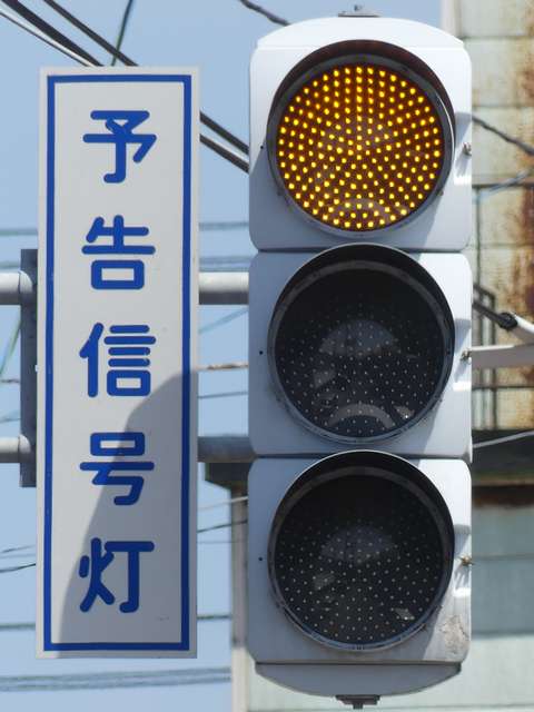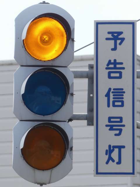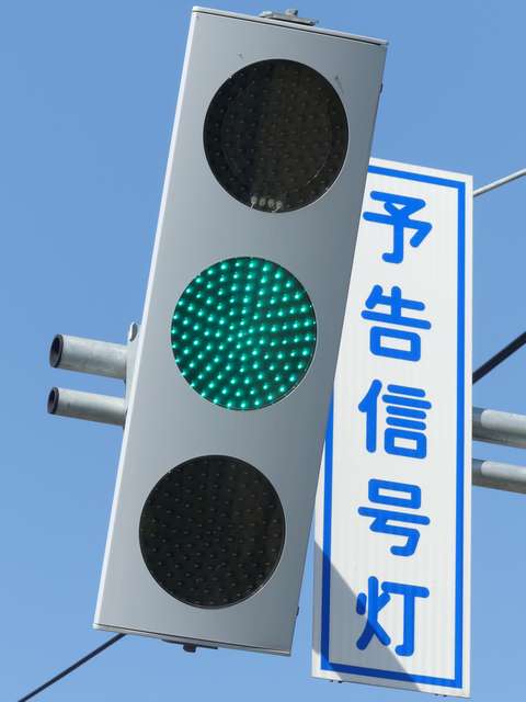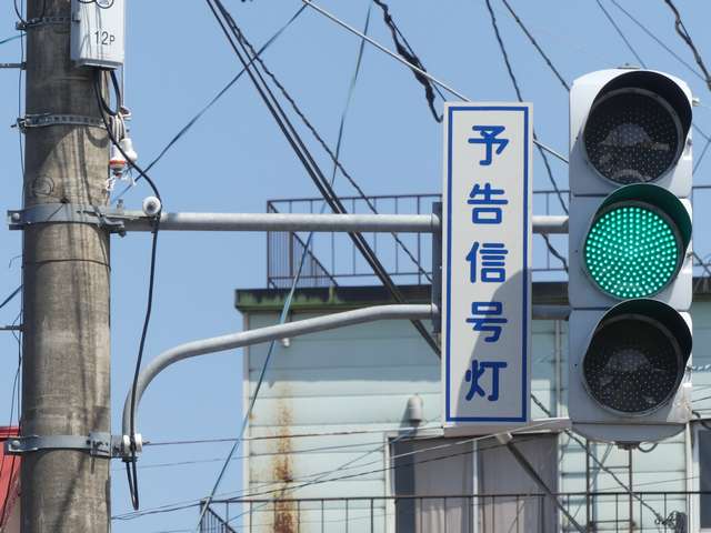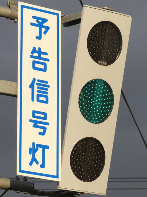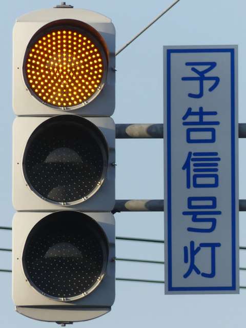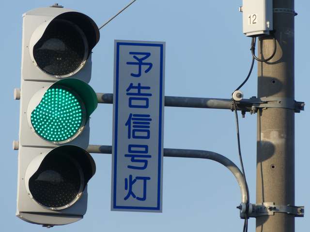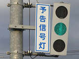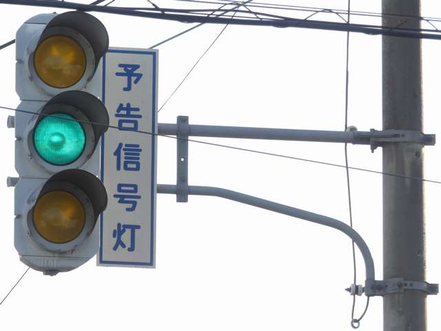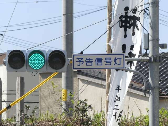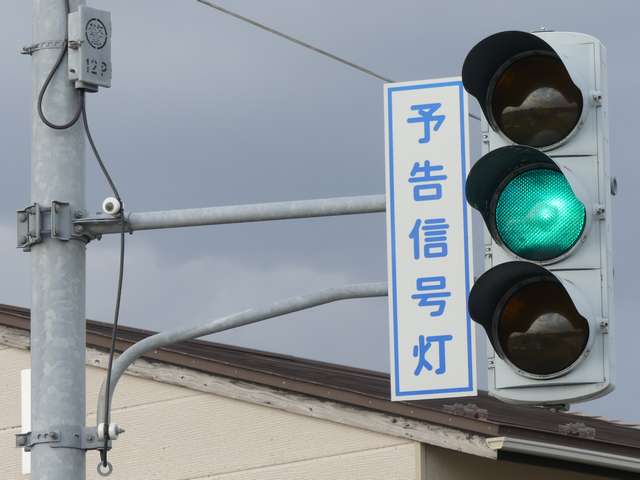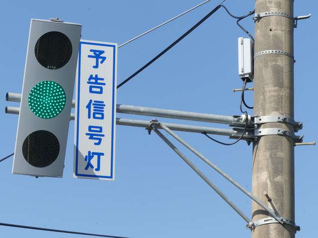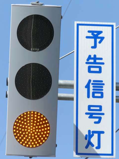 信号交差点の手前の道路がカーブしているため、「予告信号灯」が設置されています。前方の信号が黄信号になるのと同時に点滅を開始します。