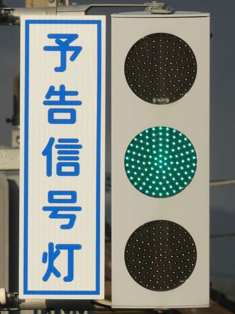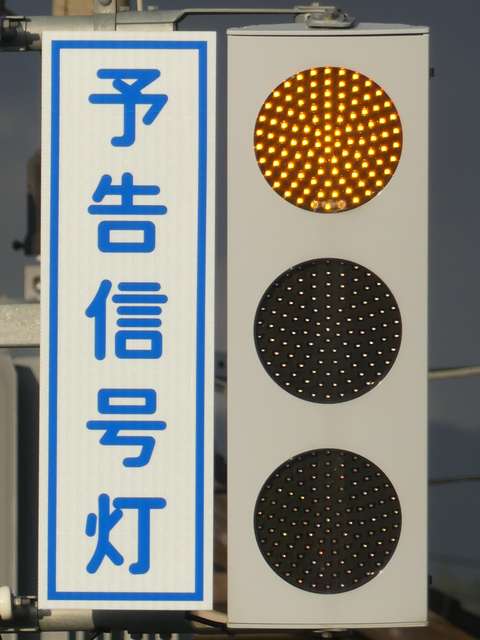 信号交差点の手前の道路がカーブしているため、「予告信号灯」が設置されています。前方の歩行者用信号が赤信号になるのと同時(車両用信号が黄信号になる3秒前)に点滅を開始します。
