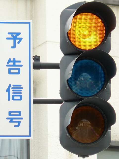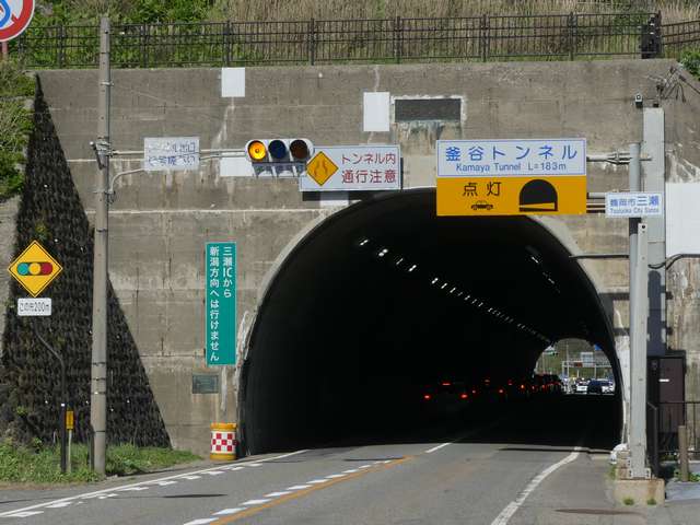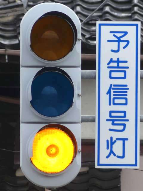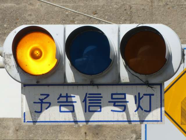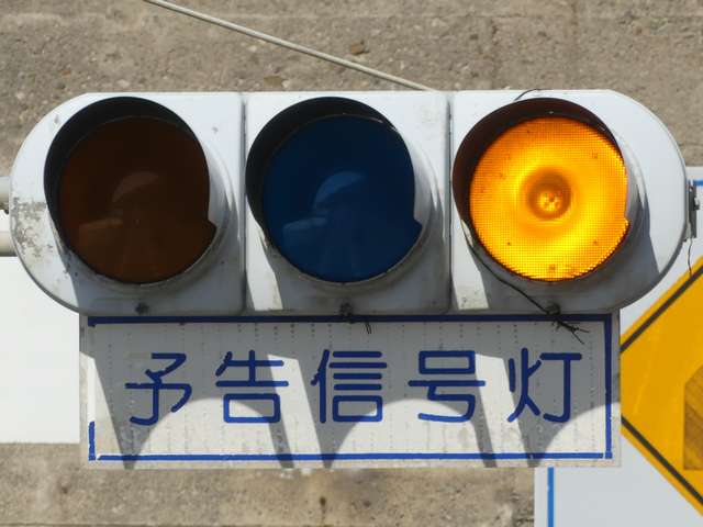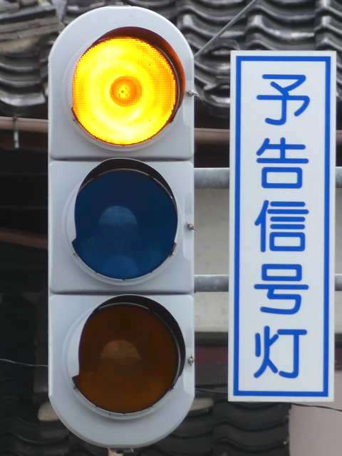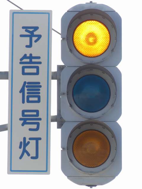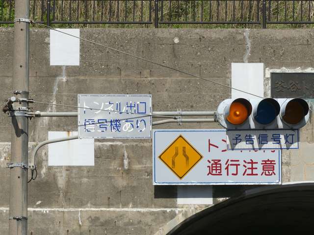 信号交差点の手前にトンネルがあるため、「予告信号灯」が設置されています。前方が青信号になっても、トンネル内に停滞車両がある可能性があるためか、前方の信号には連動せず、常時左右黄の交互点滅としています。