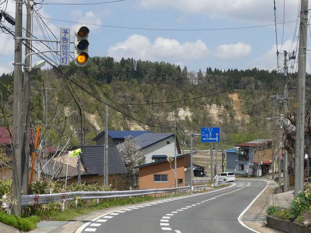 信号交差点の手前の道路がカーブしているため「予告信号灯」が設置されています。