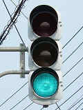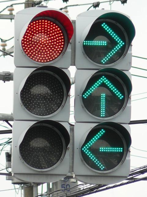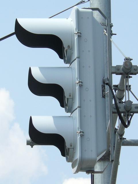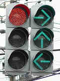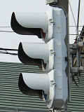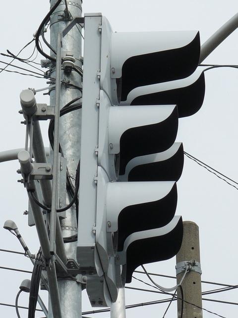積雪による視認性低下対策のためか、縦型灯器の黄と青のフードが短くされています。メーカーを問わず採用されています。