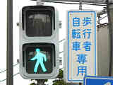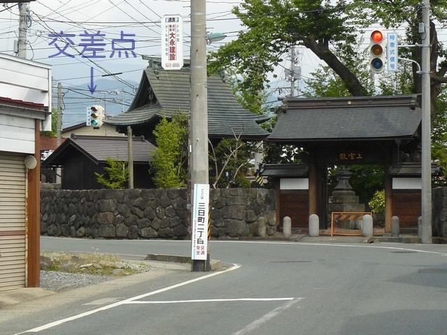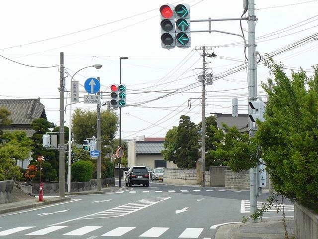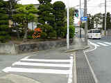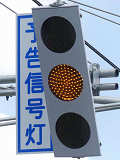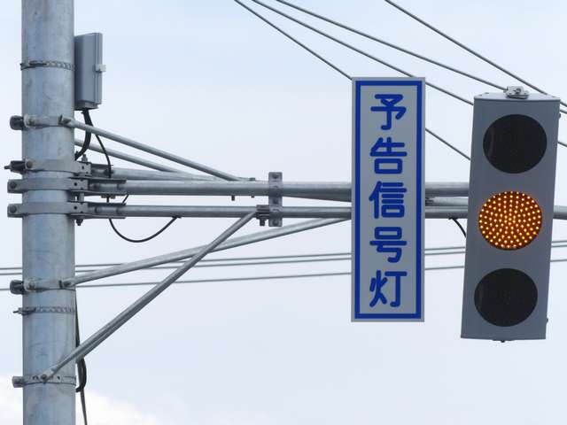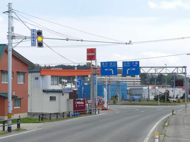 山形県の標準的な予告信号は、黄・青・黄配列の灯器を使用しますが、ここでは(LED式のため点灯しない上下の灯火は不明ですが)真ん中の黄を点滅させています。交差点の手前が急カーブとなっているため、青信号にせず常時黄点滅としているのでしょう。更新前は黄・青・黄配列の樹脂製灯器による前方非連動の予告信号だったようです。